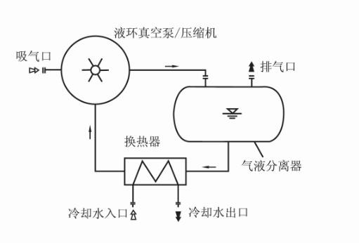 基本的2BW系列液環(huán)真空泵/壓縮機閉路循環(huán)系統(tǒng)如圖2:被抽氣體從吸氣口進入液環(huán)真空泵/壓縮機,經液環(huán)真空泵/壓縮機壓縮后與部分工作液一-起進入氣液分離器,在氣液分離器內氣液兩相得到分離,氣體從排氣口排出,工作液經換熱器被液環(huán)真空泵/壓縮機吸入進行循環(huán)使用。液環(huán)泵在工作過程中會產生熱量,主要熱量包括:真空泵/壓縮機的無效功率;吸入氣體溫度較高帶來的熱量:吸入氣體含有可凝性氣體在壓縮過程中釋放出變相熱。換熱器的主要作用是通過冷卻水冷卻工作液,使工作液溫度保持在合理的范圍之內。